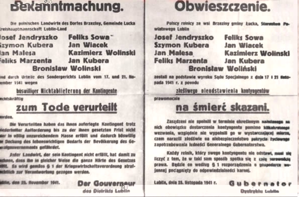 obwieszczenie gubernatora dystryktu Lublin z dnia 25 listopada 1941, informujące o skazaniu na śmierć 9 polskich rolników z Brzezin za niedostarczenie kontyngentów