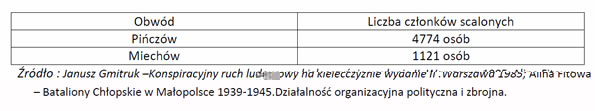 . Poniżej prezentuje w formie tabel stany organizacyjne członków BCH scalonych z AK w obwodach Miechów i Pińczów - rok 1944: