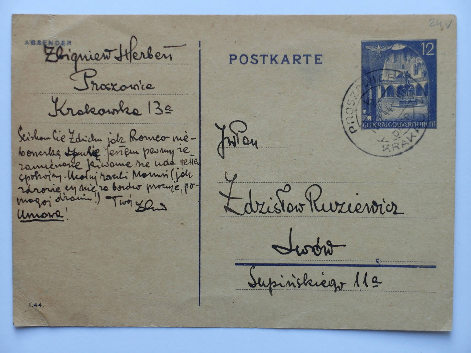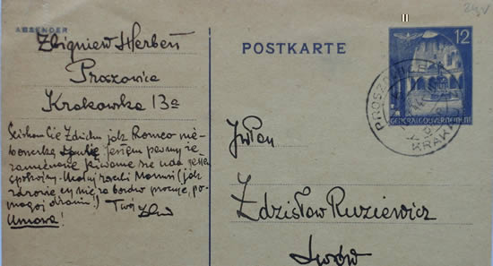 Herbertowie mieszkali wtedy w Proszowicach od ponad dwóch tygodni. Na awersie tej pocztówki Zbigniew Herbert kreśli adres korespondencyjny: Proszowice, ul. Krakowska 13a. Liczy na dalszą, stałą korespondencję z przyjacielem. Plany te jednak krzyżuje wojna: około 15 lipca 1944 r. rozpoczynają się walki o Lwów, zakończone zajęciem dotychczas niemieckiego miasta przez Armię Czerwoną.