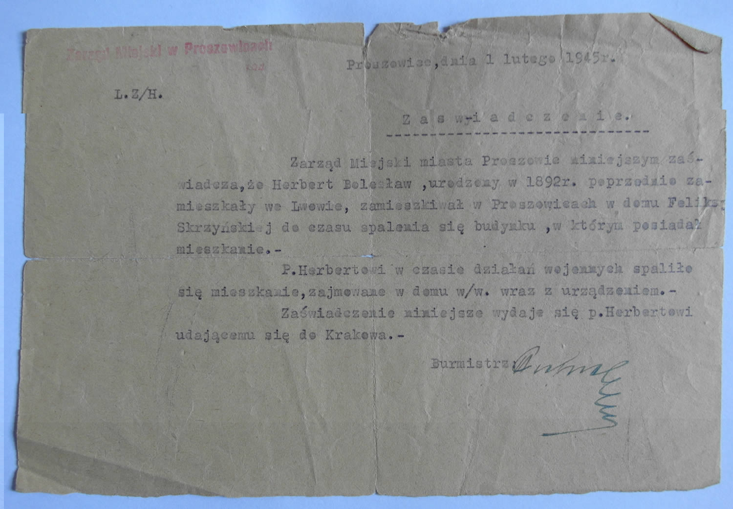 O jakiej więc spalonej kamienicy pisze Zbigniew Herbert? Wyjaśnienie znajdujemy w innym dokumencie pochodzącym z archiwum rodziny Herbertów. Jak wspomniano wcześniej, Herbertowie utracili w pożarze cały posiadany dobytek, w tym także dokumentację papierową. Taki sam los spotkał archiwum Banku Spółdzielczego, w którym pracował ojciec poety. Bolesław Herbert, szukający w styczniu 1945 r. pracy w Krakowie, zwrócił się do proszowickiego magistratu, o wystawienie zaświadczenia, które potwierdzałoby jego pobyt i pracę w Proszowicach oraz fakt utraty dokumentów. Ówczesny Burmistrz Proszowic, Feliks Ciepielewski, wystawia takie poświadczenie.