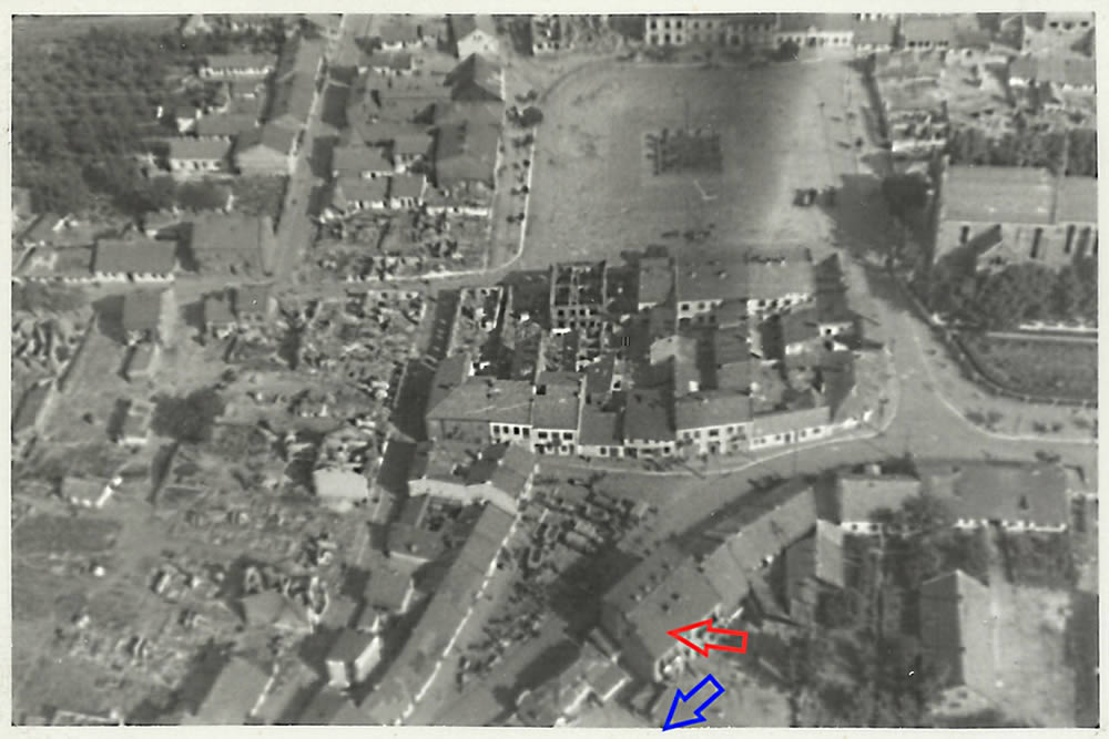 Zdjęcie poniżej zostało wykonane we wrześniu 1939 roku. Czerwona strzałka wskazuje na nim budynek przy ul. Krakowskiej 9, strzałka niebieska kierunek, w którym należałoby szukać budynku przy ul. Krakowskiej 13a - na tym zdjęciu niestety nie zmieścił się on w kadrze.
