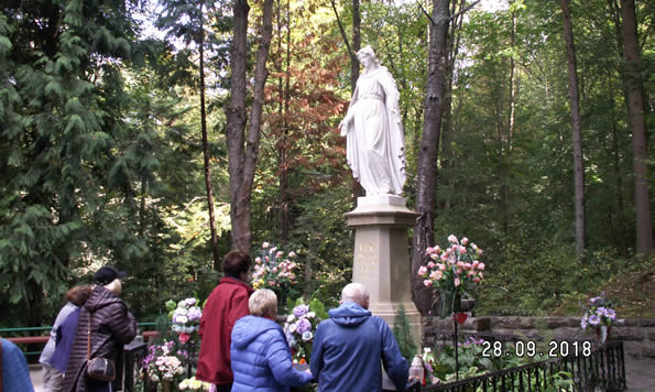 Po zapoznaniu się z atrakcjami na szczycie Góry Parkowej, zjechaliśmy kolejką ze szczytu do dolnej stacji (584 m n.p.m.) i udaliśmy się do miejsca w Parku Zdrojowym gdzie stoi od 1864 roku figura Matki Bożej Łaskawej Królowej Krynickich Zdrojów.