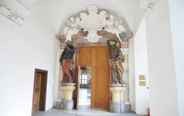Wejście do Sali Książęcej prowadzi przez misternie wykonany portal z herbem opatów lubiąskich, dźwiganym przez dwie naturalnej wielkości figury Murzyna i Indianina. Postacie te są z jednej strony przejawem XVIII-wiecznej mody na egzotykę, a z drugiej podkreśleniem potęgi Habsburgów, których władza sięgała do obu Ameryk i Afryki.