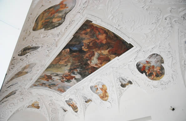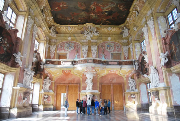 Z tematyką plafonu współgrają figury trzech cesarzy habsburskich z wieku XVII i XVIII: Leopolda I, Józefa I oraz Karola VI. W zachodniej części sali zwraca uwagę wspaniała rokokowa empora muzyczna, na której muzykowali najwspanialsi artyści ówczesnej Europy.