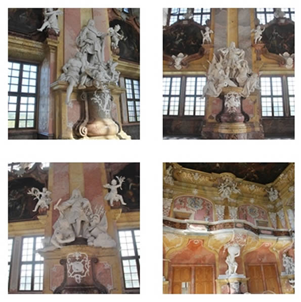 Natomiast w górnych narożnikach sali umieszczono personifikacje czterech kontynentów pod postaciami kobiecymi, nad którymi rozciągała się władza Habsburgów: Europy z bykiem, Azji ze słoniem, Afryki z lwem i Ameryki z lamą.