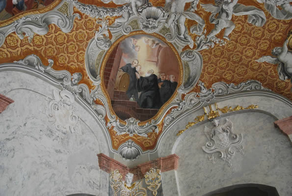 Centralną część sklepienia refektarzu zajmuje plafon Feliksa Antona Schefflera "Cudowne rozmnożenie chleba i ryb", wykonany w typie malowidła freskowego określanego mianem panoramy, która daje możliwość oglądania sceny z każdego miejsca sali. Plafon refektarza otacza piękna dekoracja ornamentalna, imitująca złocone tapety. Dopełnienie stanowi osiem medalionów, ukazujących sceny z życia św. Benedykta (w habicie czarnym) i św. Bernarda (w habicie białym).