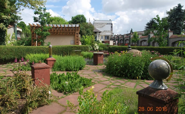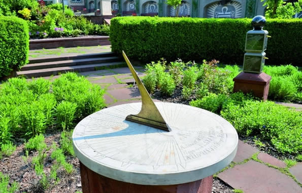 ogródek aptekarski z roślinami leczniczymi i zegarami słonecznymi