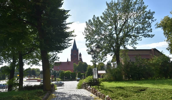 Inowrocław, kościół pw. Zwiastowania Najświętszej Maryi Pannie - widok od strony zachodniej. Strzelista wieża świątyni mierząca 77 metrów, 8 września 1939 roku stała się stanowiskiem ogniowym karabinu maszynowego Straży Obywatelskiej