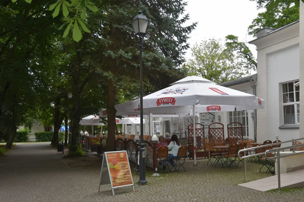 Restauracja Zdrojowa z widocznym fragmentem budynku dawnej pijalni wód - po stronie prawej