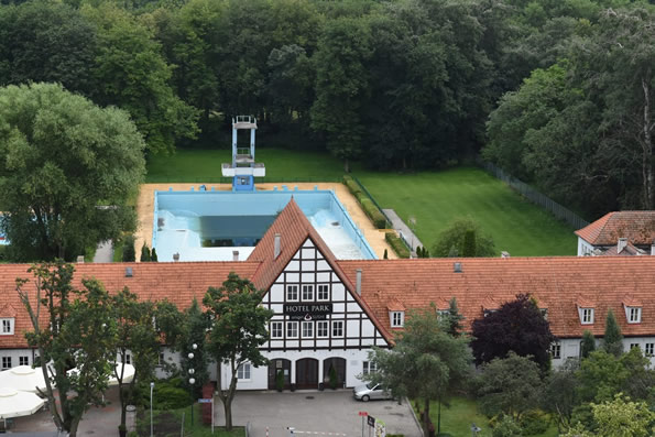 basen odkryty w Parku Solankowym - zdjęcie wykonano z tarasu widokowego Szpitala Uzdrowiskowego Energetyk