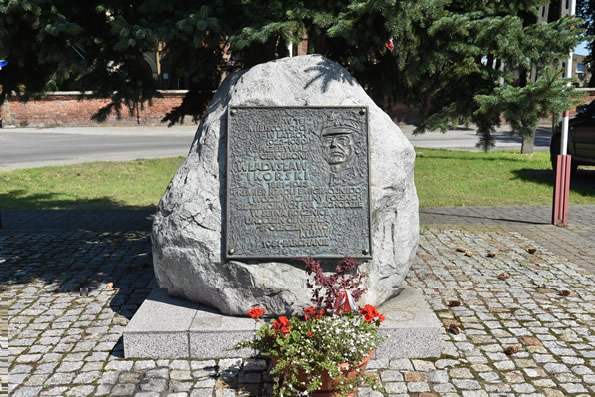 wieś Parchanie - głaz na skwerze przed kościołem z tablicą informującą o pobycie gen. Władysława Sikorskiego