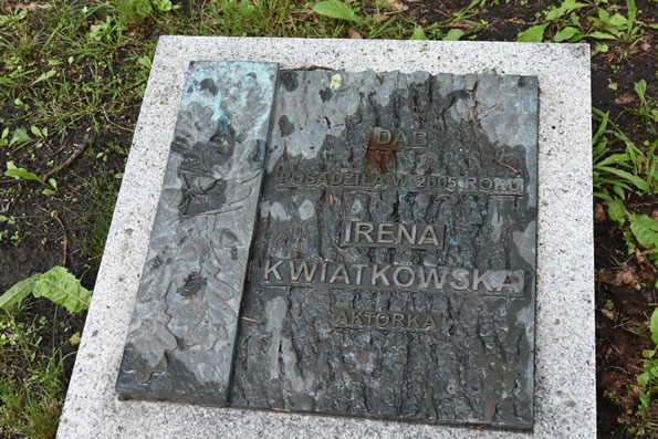 tablica informująca o posadzonym dębie przez Irenę Kwiatkowską