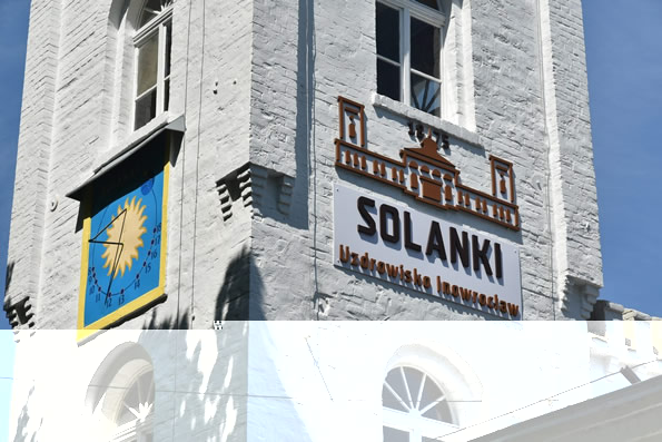 zegar słoneczny i napis "Solanki" Uzdrowisko Inowrocław na wieży pierwszego obiektu leczniczego z lat 1875-1876