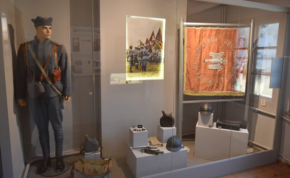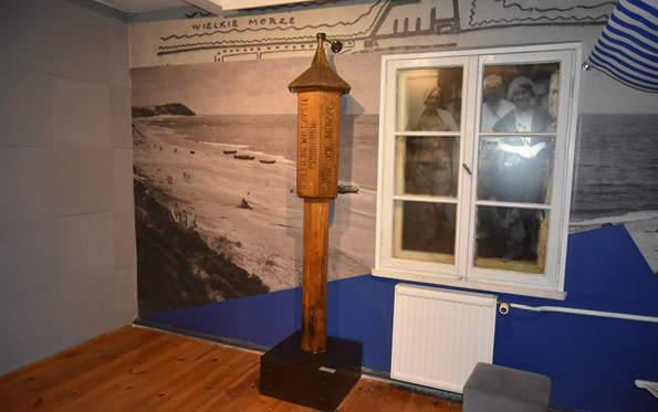 Władysławowo. Hallerówka - Muzeum, ekspozycja przedstawia m.in.: Sztandar Związku Hallerczyków Sambor, przed 1939; mundur żołnierza Błękitnej Armii - rekonstrukcja; sztylpy oficerskie, skórzane - element umundurowania wojsk gen. J. Hallera ok.1920 r.; bagnet i ładownicę do karabinu Lebel - wykorzystywany w Armii Hallera; chlebak z ok. 1920 r.