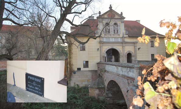 Lubiąż, Opactwo Cystersów, umieszczona przy bramie głównej tablica wskazuje najwyższy poziom wody po wylaniu rz. Odry w lipcu 1997 r., założenie - Opactwo położone jest nad rzeką