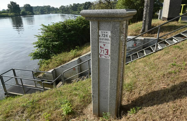 Trestno, wodowskaz i słupek upamiętniający powódź z lipca 1997 roku