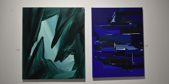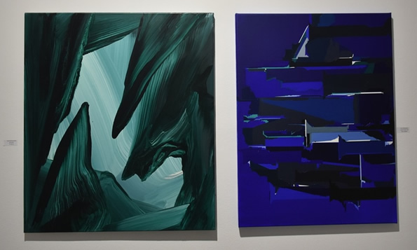 obrazy: po lewej obraz Anny Kołodziejczyk z cyklu Architektura i wnętrza, po prawej obraz Kamila Moskowczenko bez tytułu - 2019