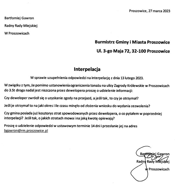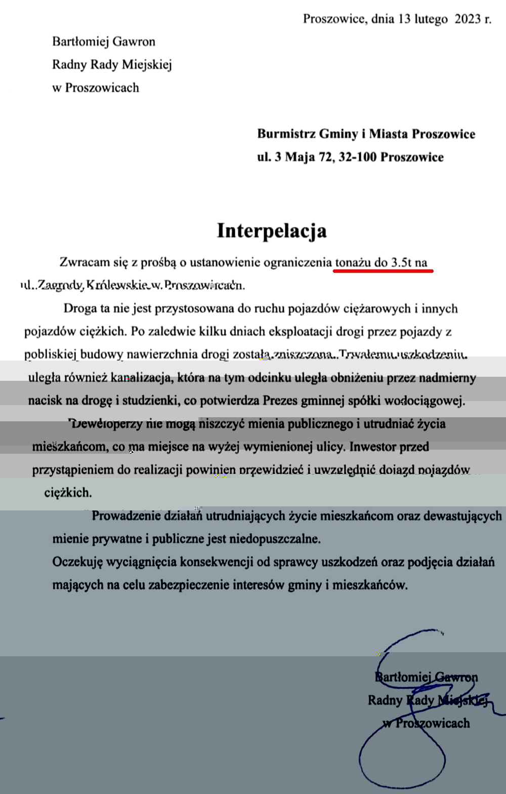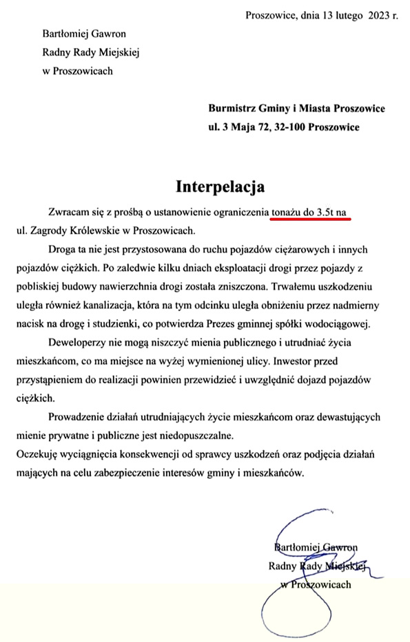 13.02.23 - radny Gawron składa interpelację alarmując o tym, że niszczone jest mienie publiczne i prosi o wprowadzenie ograniczenia tonażu na tej ulicy.