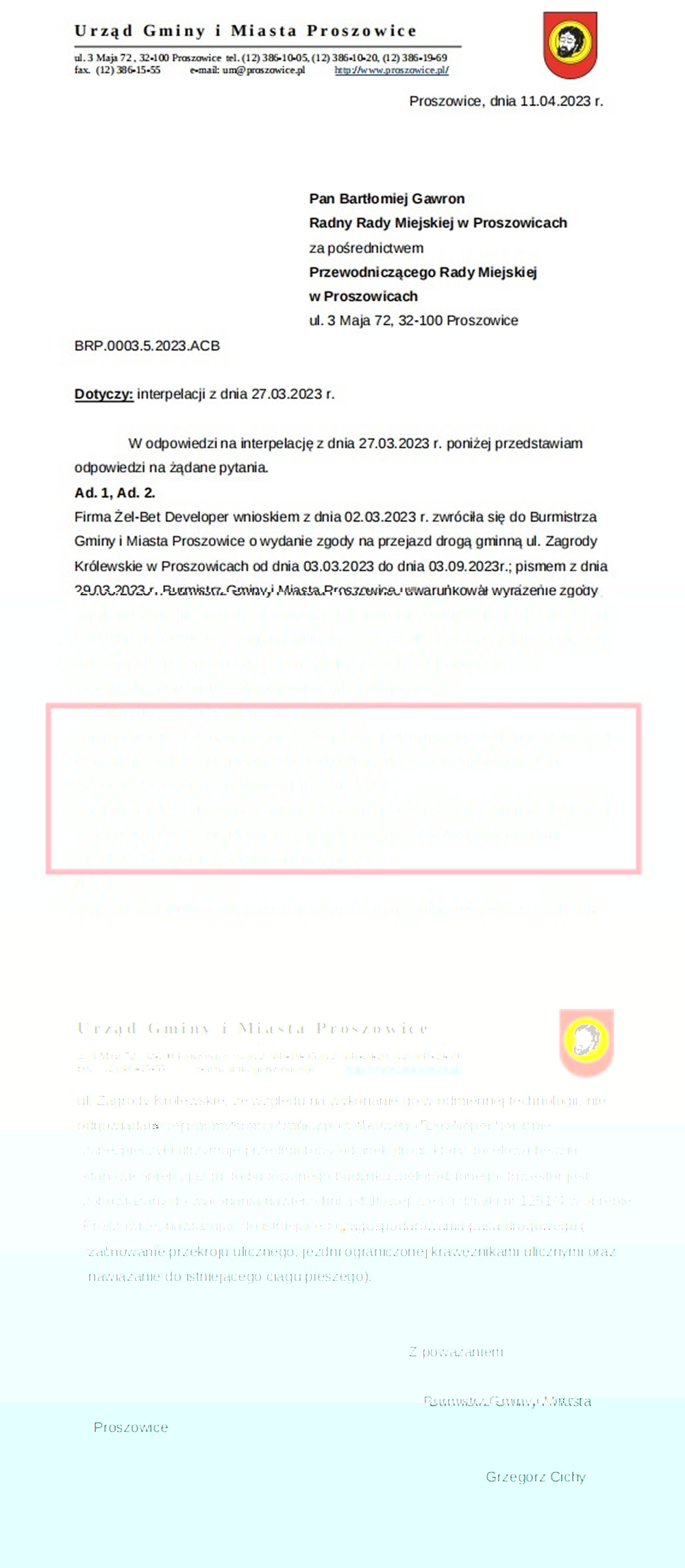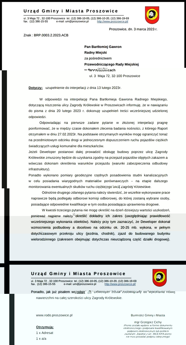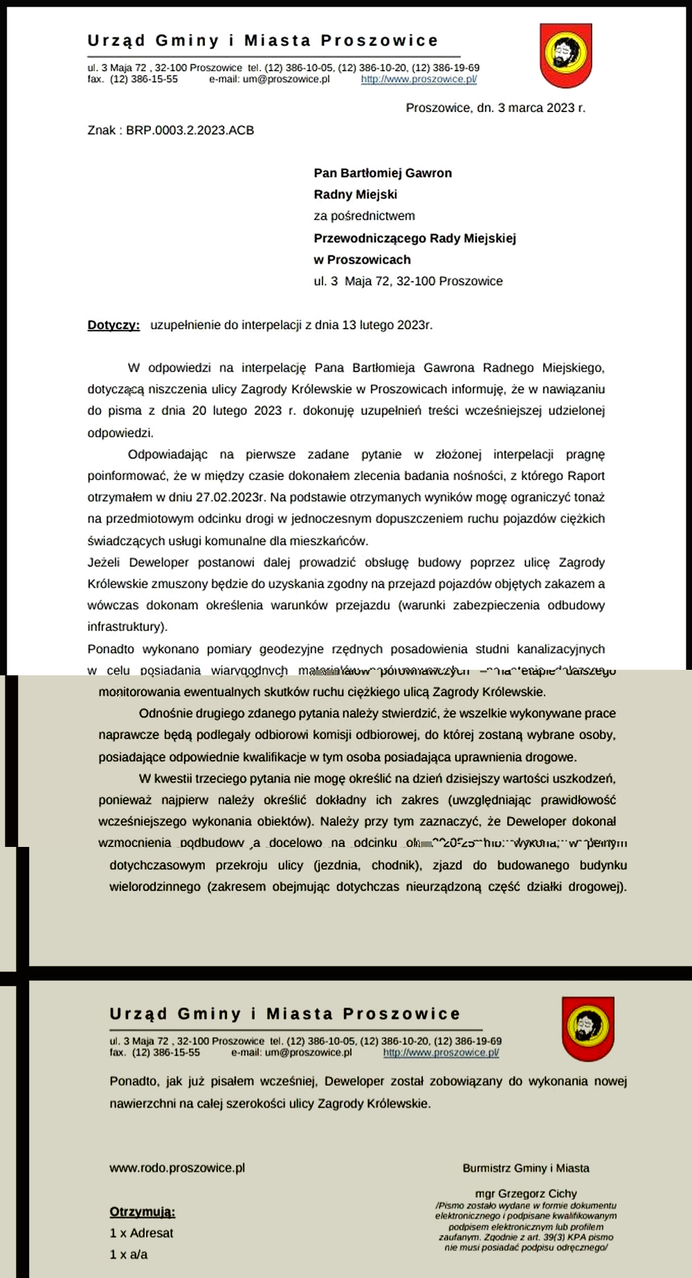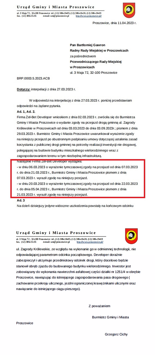 11.04.23 - Burmistrz odpowiada na interpelację radnego Gawrona informując, że zezwolenia zostały wydane przez niego no właśnie... w ekspresowym tempie bo już w jeden dzień po wpłynięciu pisma o zezwolenie zarówno w przypadku pierwszego zezwolenia obowiązującego od 7 do 21 marca jak i drugiego (22 marca - 5 kwietnia). Co ciekawe, dalsze zezwolenia zostały uwarunkowane podpisaniem umowy z właścicielami ciężkiego sprzętu celem "ustalenia zasad korzystania z publicznej drogi gminnej na potrzeby realizacji inwestycji...". Jak wynika jednak z informacji, właściciel ciężkiego sprzętu nie podpisał jednak tej umowy!