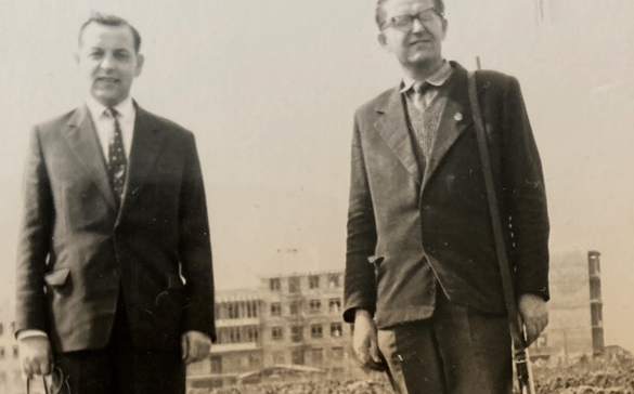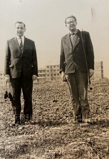Wujek, jako najmocniej zaangażowany w walkę o pagórek mocno to przeżył i długo nie mógł się pogodzić z utratą części ojcowizny. Na zdjęciu widać go z prawej strony, a dla żartu dodam, że fuzja na ramieniu może świadczyć o gotowości walki z "okupantem". Pan z lewej, to nasz sąsiad, rodowity Warszawiak, który kiedyś przyjechał z nami do Proszowic.