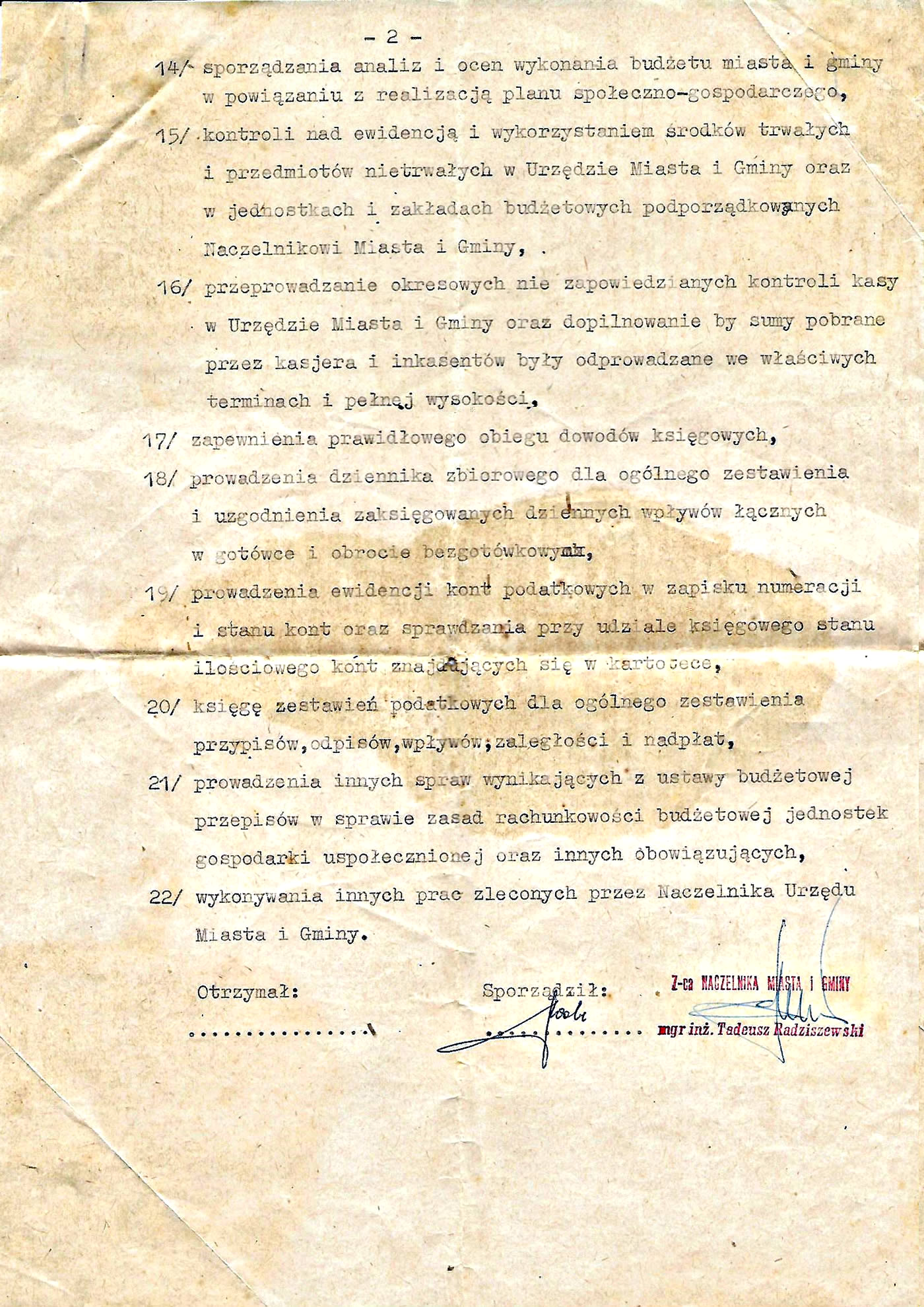 Czy ktoś ze zdrowymi zmysłami po przeanalizowaniu tego zakresu czynności powiedziałby, że to co tam pisze jest możliwe do wykonania przez jedną osobę? Niektóre punkty tegoż zakresu czynności, to tylko jedno zdanie jak np. pkt. Czwarty: sporządzanie sprawozdań liczbowych i opisowych z wykonania budżetu. Kto tam nie pracował, to nie wie, że w tym wydawało by się niewinnym małym punkcie mieści się ogrom pracy.