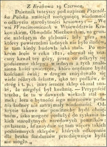 2. W dniu 30 czerwca 1823 r., Gazeta Warszawska, nr 103, na stronie pierwszej czasopisma drukuje pełny tekst z czasopisma Pszczółka Polska, o starożytnym odkryciu we Wrocimowicach, jako informacja: z Krakowa 19 czerwca. Pełny tekst z Gazety Warszawskiej, nr 103, przedstawia niżej zamieszczona fotokopia.