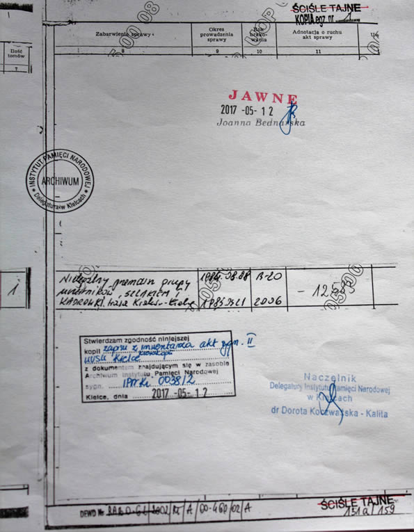 fotokopia jednej z kart operacyjnego działania Służby Bezpieczeństwa założonych dla Adama Słupka pod kryptonimem Dekadent z Marszu Szlakiem I Kompanii Kadrowej w 1984 r.