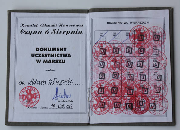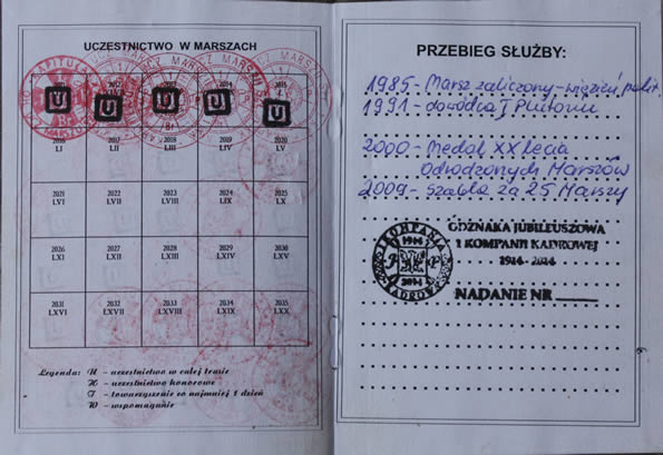 strona 3 i 4 legitymacji uczestnictwa w Marszu Adama Słupek Szlakiem I Kompanii Kadrowej