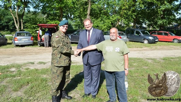 Szewce, 12 sierpnia 2017. Marsz Kadrówki Szlakiem I Kompanii Kadrowej. Od lewej: oficer prasowy Kadrówki Michał Andrzej Rybak, Minister Urzędu do Spraw Kombatantów i Osób Represjonowanych Jan Józef Kasprzyk oraz Chorąży Sztandaru Piłsudczyków Adam Słupek