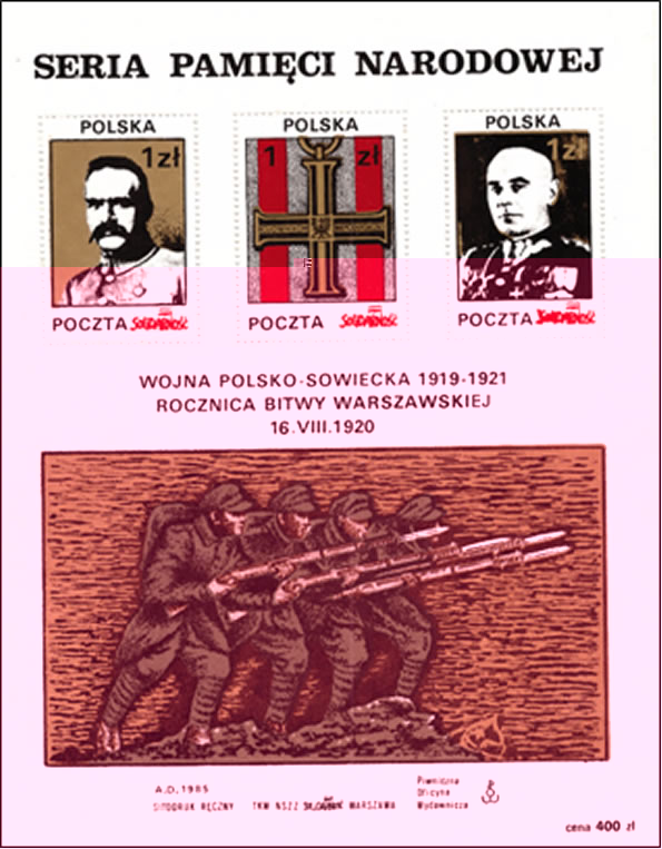 Wielobarwny bloczek poświęcony Pamięci Narodowej w 70 rocznicę Bitwy Warszawskiej, wydany przez Pocztę Solidarności. Przypomina zdarzenia z przeszłości, objęte PRL-owską cenzurą. Bloczek posiada trzy znaczki z perforacją o nominale 1 zł. Wydany został w 1985 roku przez Piwniczną Oficynę Wydawniczą, TKW NSZZ Solidarność Warszawa.