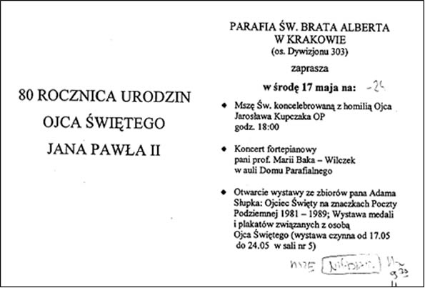 ogłoszenie zapraszające na wystawę Adama Słupka w Kra-kowie pw. św. Brata Alberta os. Dywizjonów 303 pt. Ojciec Święty na znaczkach Poczty Podziemnej 1981 - 1985, wystawa medali i plakatów związkach z osobą Ojca Świętego