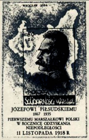 znaczek wydany w 1984 r., bloczek poświęcony. Józefowi Piłsudskiemu, pierwszemu Marszałkowi Polski w rocznicę odzyskania Niepodległości 11 Listopada 1918 r. Na znaczku: Lewy profil twarzy Józefa Piłsudskiego, w tle terytorium II Rzeczypospolitej. Źródło: zbiory Adama Słupka.