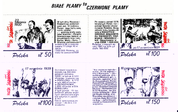 Zbrodnie Katyńskie stanowią ciekawy i rozbudowany zbiór Adama Słupka. Do najciekawszych pod względem grafiki i tekstu zaliczyć należy blok zatytułowany Białe plamy to czerwone plamy. Na bloku znajdują się cztery znaczki przedstawiające czasokres: