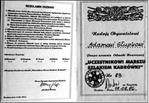 fotokopia dokumentu nadania Adamowi Słupek Uczestnikowi Marszu Szlakiem Kadrówki, w dniu 12 Sierpnia 1986 r.