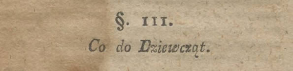 Nauki były też same, starszym raz w tydzień obowiązki wychowania dzieci, zarządzanie domem, czeladzią, rachunków domowych uczono, a wszystkie szyć, wyszywać, prząść, dziergać siatki, Organiścina była do tego Mistrzynią, krawieczyzny iak gorsety robić, i suknie wieyskie wyuczała. Żeby lud rolniczy, do ochędostwa [porządku], porządku, menażu z młodu wzywaiąc, miała każda dziewczyna szufladę w szkole zamykaną, w tey porządki i potrzebne rzeczy chowała, a Nauczyciel, Organiścina, wyrywkiem często rewidowała, porządnym nagroda, pluchowym [brudasom] oprócz nagany stosowną do wieku karę naliczano. Reguły szkolne, nim dzieci odeszły zawsze w głos czytane były, i co na dzień przyszły miały przynieść, nauczyć się, rozkazywano a zawsze na tablicy spisane widziały.