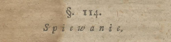 Nic bardziey uwagi ludzi w Kościele niewzbudza [nie wzbudza] i utrzymuie, iak nabożne śpiewanie, mamy do tego Pieśni Narodowe ułożone, dzieci w szkole napamięć [na pamięć] uczyły się. Organista, Not, Tonu wyuczył, i przy wielkim Ołtarzu w szeregu klęcząc, na głosy, wyraźnie każde słowa wymawiaiąc śpiewali, z czasem Rodzice poięli Notę i słowa, i modlitwy razem z dziećmi śpiewali. Modlitwy Narodowe czułemi [czułymi] słowami dobrane, każdy z serca, uszanowaniem, iakie Bogu Naywyższemu winien wymawiał, powtarzał, i takim, bydź iak się modlił starał, a opuszczaiąc Dom Boży z niego poprawę obyczaiów wynosił.