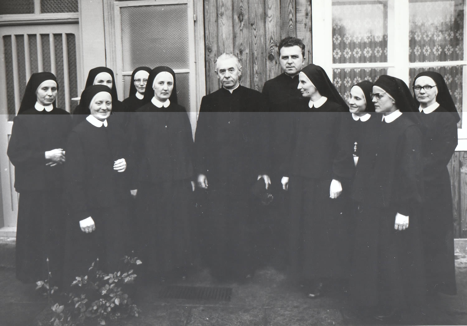 1978, 50-lecie zakonu w Proszowicach Na zdjęciu proboszcz ks. Marian Wieczorek (w środku), ks. wikariusz Marian Haczyk, siostry od lewej: Franciszka Góra, Imelda Sokół, Romualda Bańdur, Celestyna Zając, Cecylia Piekosz, Aniceta Belniak - przełożona domu, Noemi Dalska, Danuta Kaczmarczyk, Hieronima Krzyżak