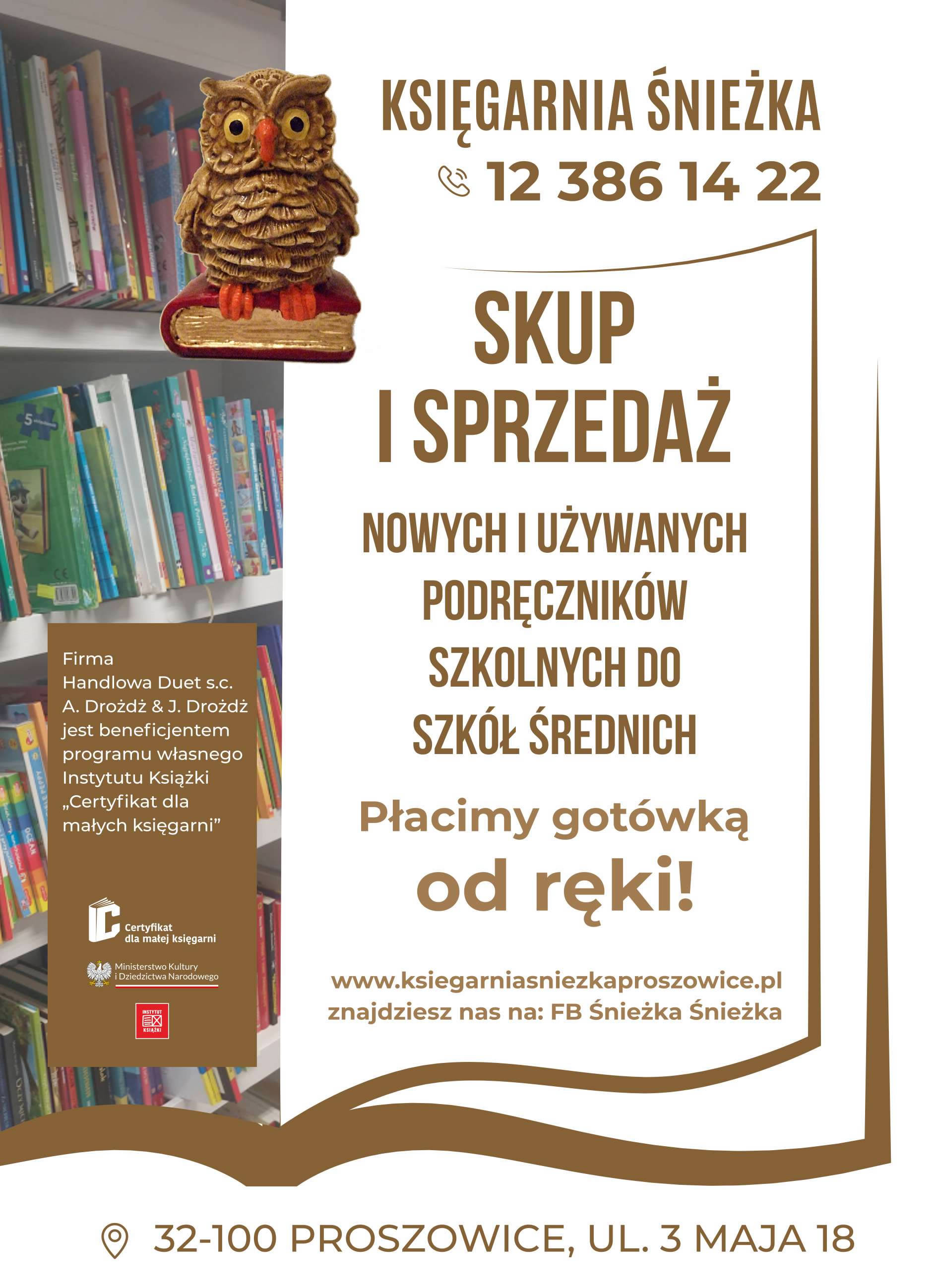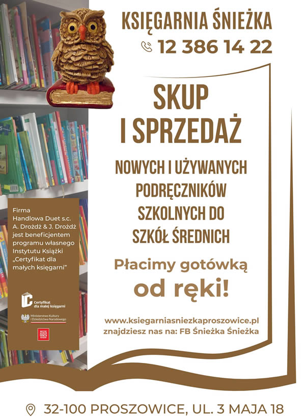 Księgarnia Śnieżka; tel. 12 386 14 22, 32-100 Proszowice, ul. 3 Maja 18, www.ksiegarniasniezkaproszowice.pl, FB Śnieżka Śnieżka.