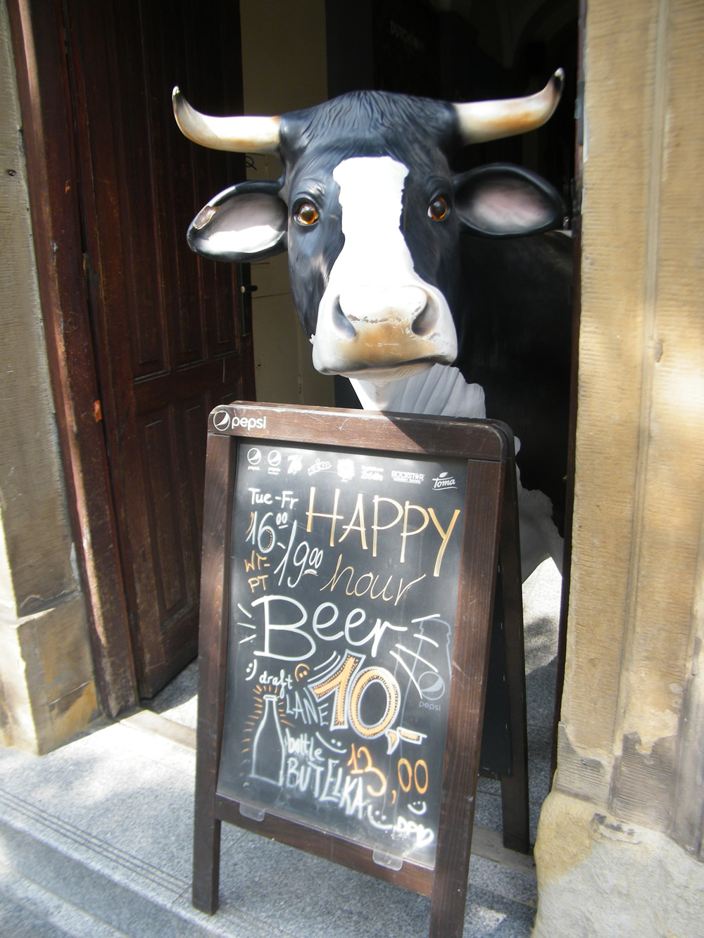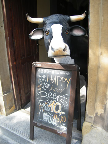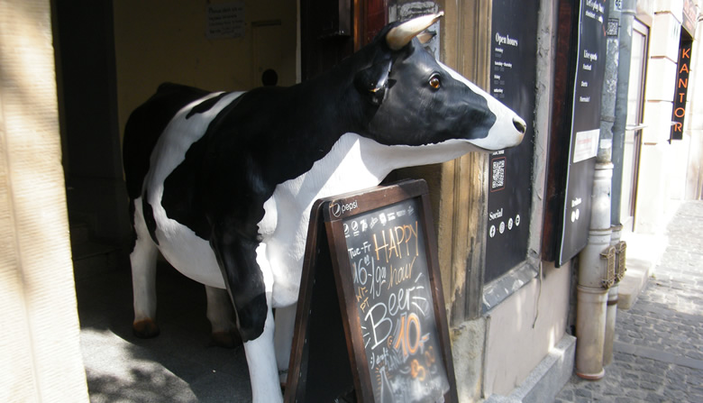 Pewien, krakowski lokal mający w swym menu także piwo, wykorzystał właśnie krowią wizerunek do promocji tegoż trunku. Taka sztuczna krówka rasy holsztyńsko-fryzyjskiej, litościwym wzrokiem wyszukuje klientów przed wejściem. Główny prym na planszy wiedzie tzw. "wesołe piwo" w promocyjnej cenie dziesięciu złotych o wyznaczonej godzinie zakupu.