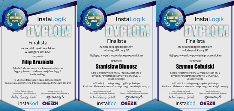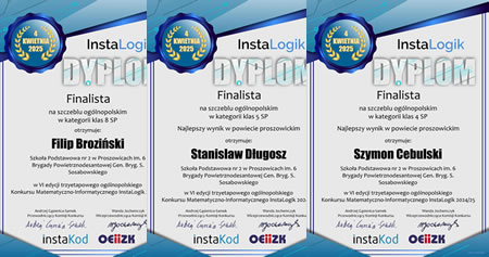 Uczniowie ze Szkoły Podstawowej nr 2 w Proszowicach: Filip Broziński klasa 8a, Stanisław Długosz klasa 5b i Szymon Cebulski z klasy 4a, zostali finalistami na szczeblu ogólnopolskim VI. edycji 2024/2025 konkursu InstaLogik.