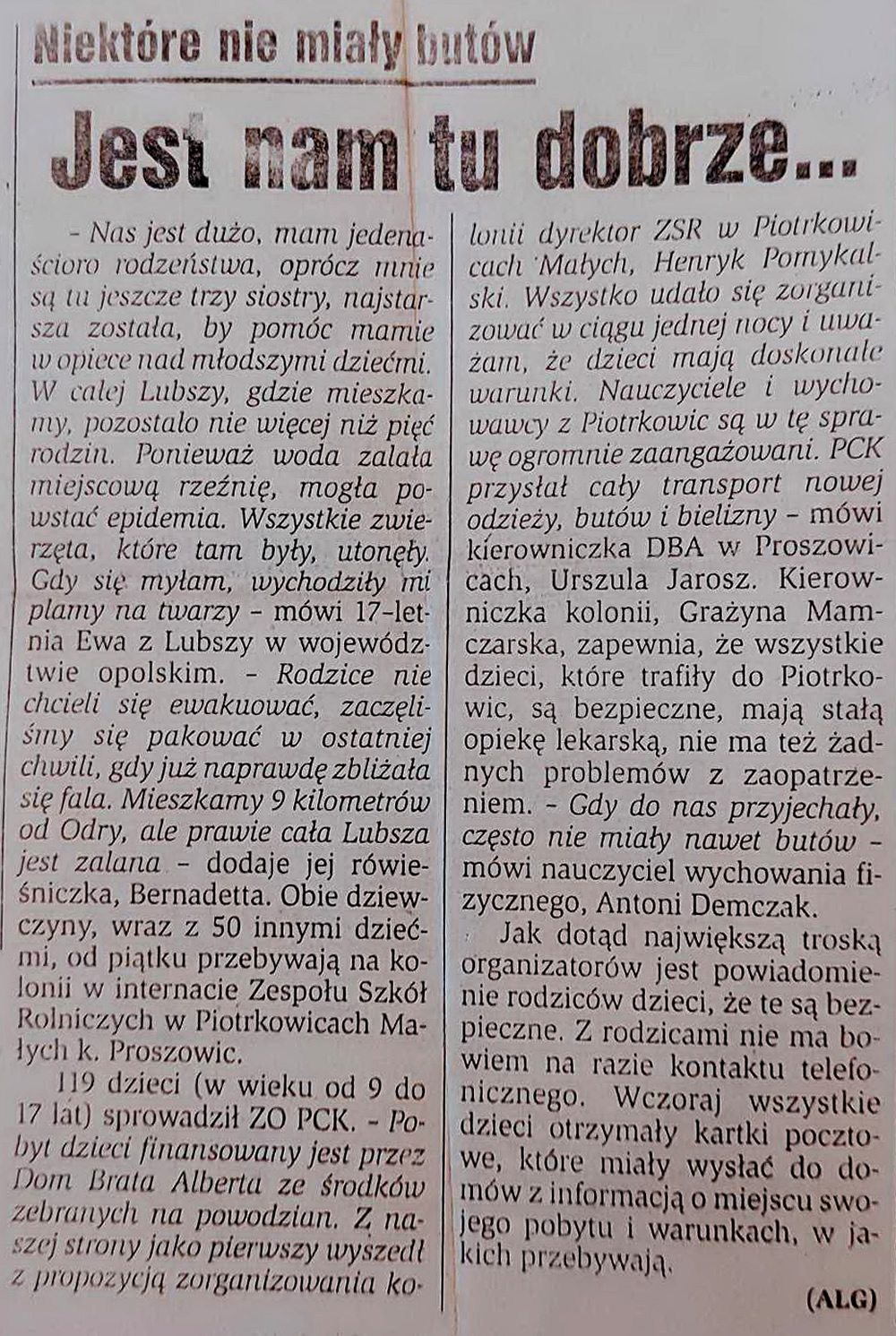 Pracowałam jako wychowawca w Zespole Szkół w Piotrkowicach Małych. Podczas wakacji internat był pusty. Błysnęła mi myśl, a może byśmy go wykorzystali?... Skontaktowałam się z dyrektorem szkoły Henrykiem Pomykalskim i taką propozycję przedstawiliśmy kierowniczce Caritasu Urszuli Jarosz. Podjęła sprawę. Dzieci z Lubszy w powiecie opolskim zostały przywiezione do naszego internatu przez ks. Jana Iłczyka - proboszcza parafii w Proszowicach.