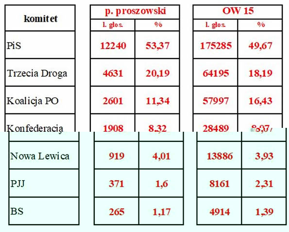 Na godzinę 17.00 wiemy jakie mamy wyniki w powiecie proszowickim. Bez zaskoczenia: 1. m-ce PiS, 2. Trzecia Droga, 3. Koalicja PO, 4. Konfederacja, 5. Nowa Lewica, 6. PJJ, 7. BS. Podobna kolejność na razie jest także w naszym Okręgu (15).