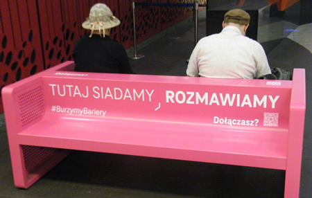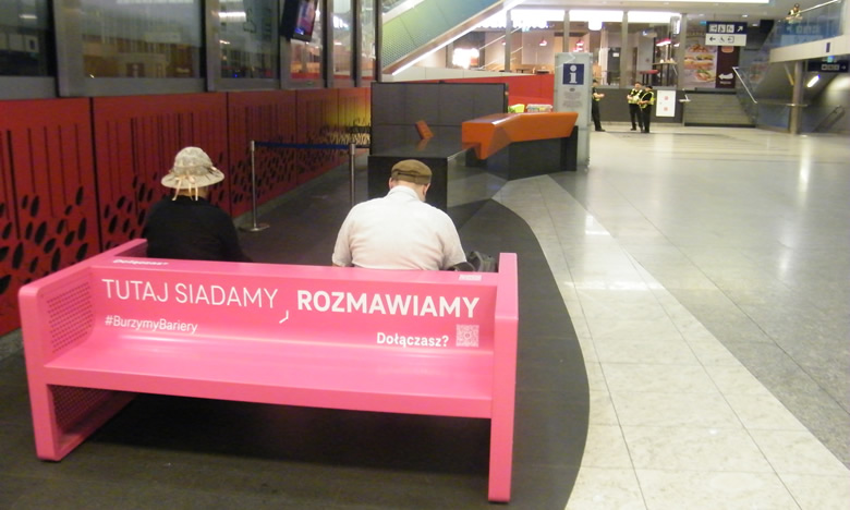 A takie warunki i szanse są specjalnie zaadoptowane w tym kierunku zdobycia odwagi. Takim miejscem jest np. poczekalnia na dworcu kolejowym Krakowie Główny przy ulicy Pawiej 5a. W bocznym przejściu korytarza jest zainstalowana obustronna ławeczka w różowy kolorze i zachęcającym tytule: "TUTAJ SIADAMY, ROZMAWIAMY".