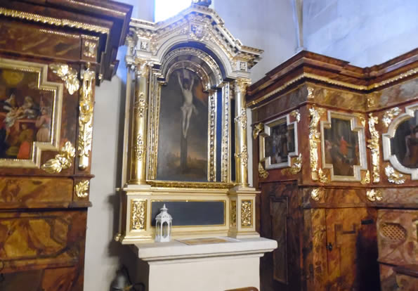 W nawie południowej kolegiaty znajduje się wczesnobarokowy ołtarz z I połowy XVIII wieku, z barokowym krucyfiksem umieszczonym na tle płaskorzeźby z widokiem na Jerozolimę. Po dwóch stronach krzyża znajdują się pary kolumn z rzeźbą Matki Bożej Bolesnej i św. Jana Apostoła. Nad krzyżem znajduje się tzw. gloria z aniołami.