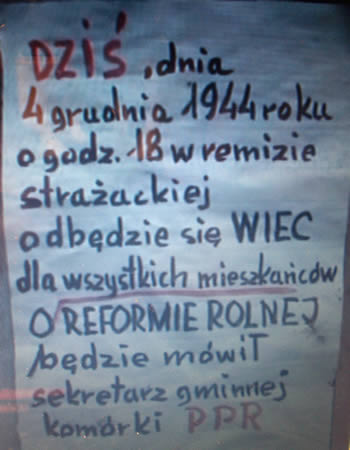 takie ogłoszenia wzywały mieszkańców wsi na spotkania przed parcelacją ziem dworskich (fot. zbiory autora)
