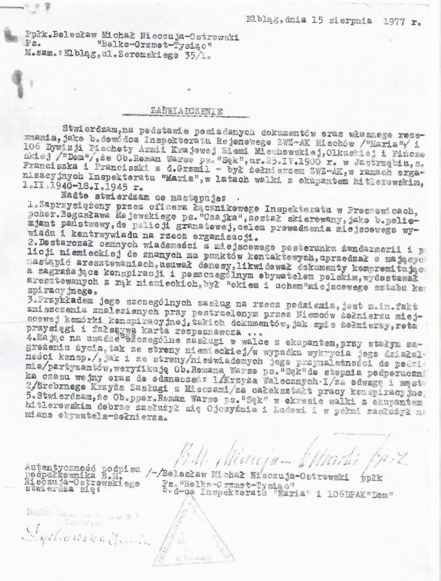 Te i inne przykłady, to piękne świadectwo o Romanie Warso, żołnierzu AK. Jeszcze w randze podpułkownika Michał Nieczuja-Ostrowski "Bolko", "Grzmot", "Tysiąc", z datą 15 sierpnia 1977 roku w Elblągu, w stosunku do R.Warso wydał zaświadczenie. Jego fragmenty: [...] Stwierdzam, że Ob. Roman Warso ps. "Sęk" ur. 25 IV 1900 roku był żołnierzem ZWZ-AK w latach 1 II 1940-18 I 1945 r.
