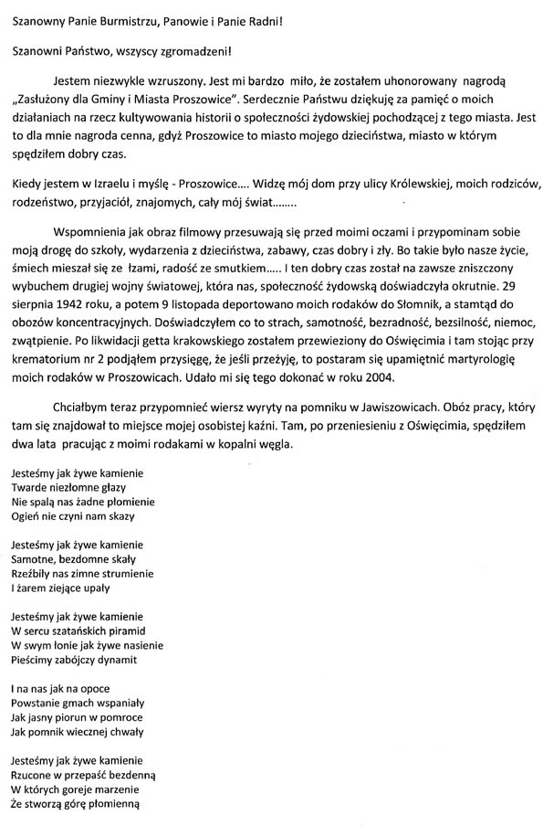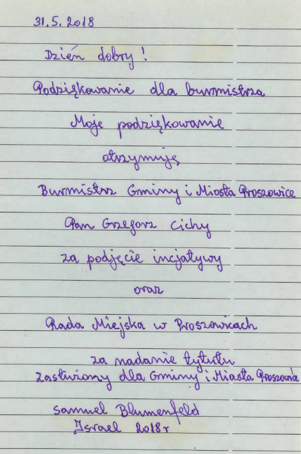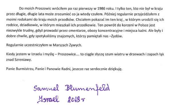 Przyznanie Panu Samuelowi Blumenfeldowi tytułu Zasłużony dla Gminy i Miasta Proszowice jest uhonorowaniem za trud i poświęcenie w kultywowaniu pamięci o przodkach i zdarzeniach związanych z ich zagładą. Dzięki jego determinacji rok 1942 dla wielu Żydów stał się księgą, wpisaną na zawsze w ich pamięć.