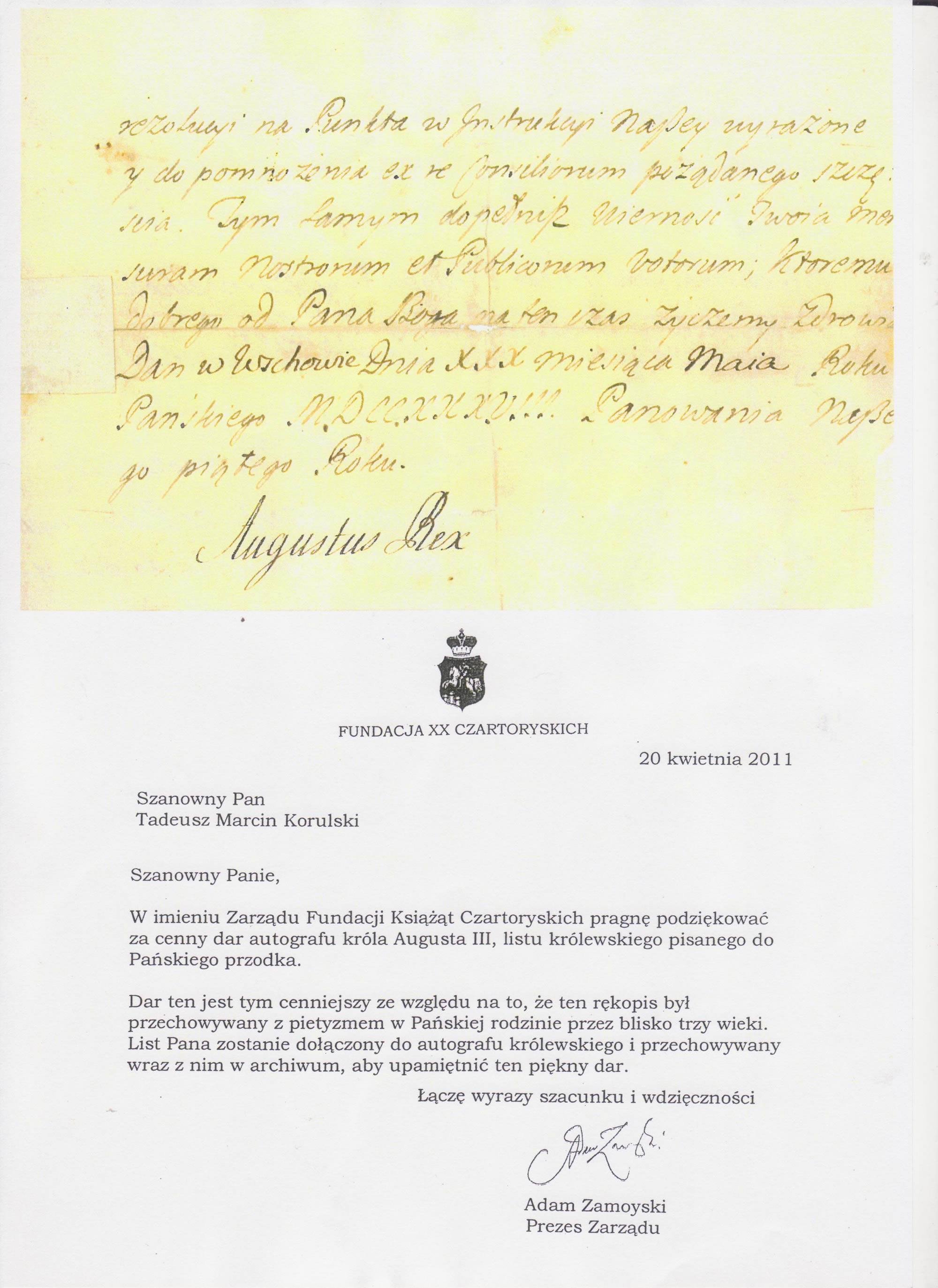 Dalsza części pisma od Tadeusza Marcina Korulskiego: 1 list (oryginał), który moja rodzina przechowywała przez prawie 3 wieki. Przekazałem do Muzeum Narodowego Biblioteki książąt Czartoryskich przez Fundację ks. Czartoryskich w Krakowie.