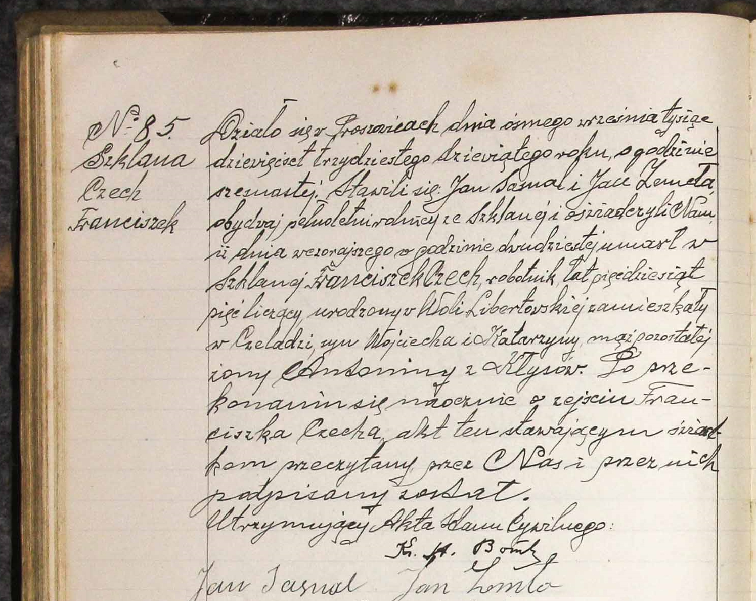 akt zgonu Franciszka Czecha wystawiony przez proboszcza parafii Proszowice
