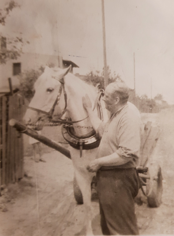 Józef Kozieł (zięć Franciszka Czecha) z koniem Siwkiem na posesji w Czeladzi przy ul. Niwa, dom został wybudowany tuż przed wojną przez Franciszka Czecha